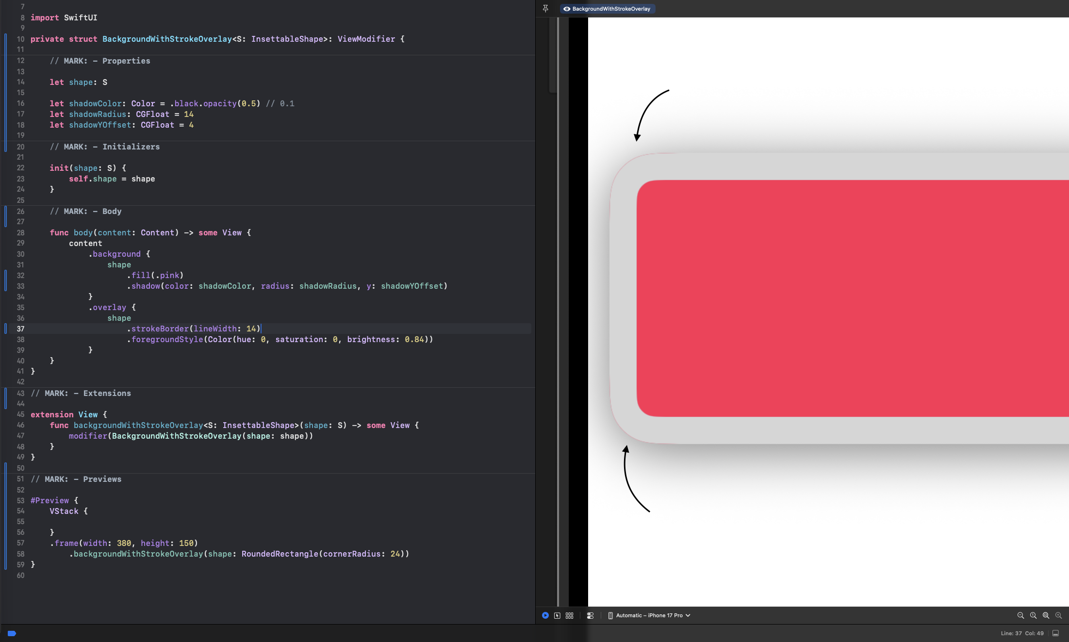 While writing custom view modifier I ran into unexpected behavior of .strokeBorder modifier. The underlying content seem to be “bleeding” outside of the stroke border edges, even though they share the exact same shape for their layout.