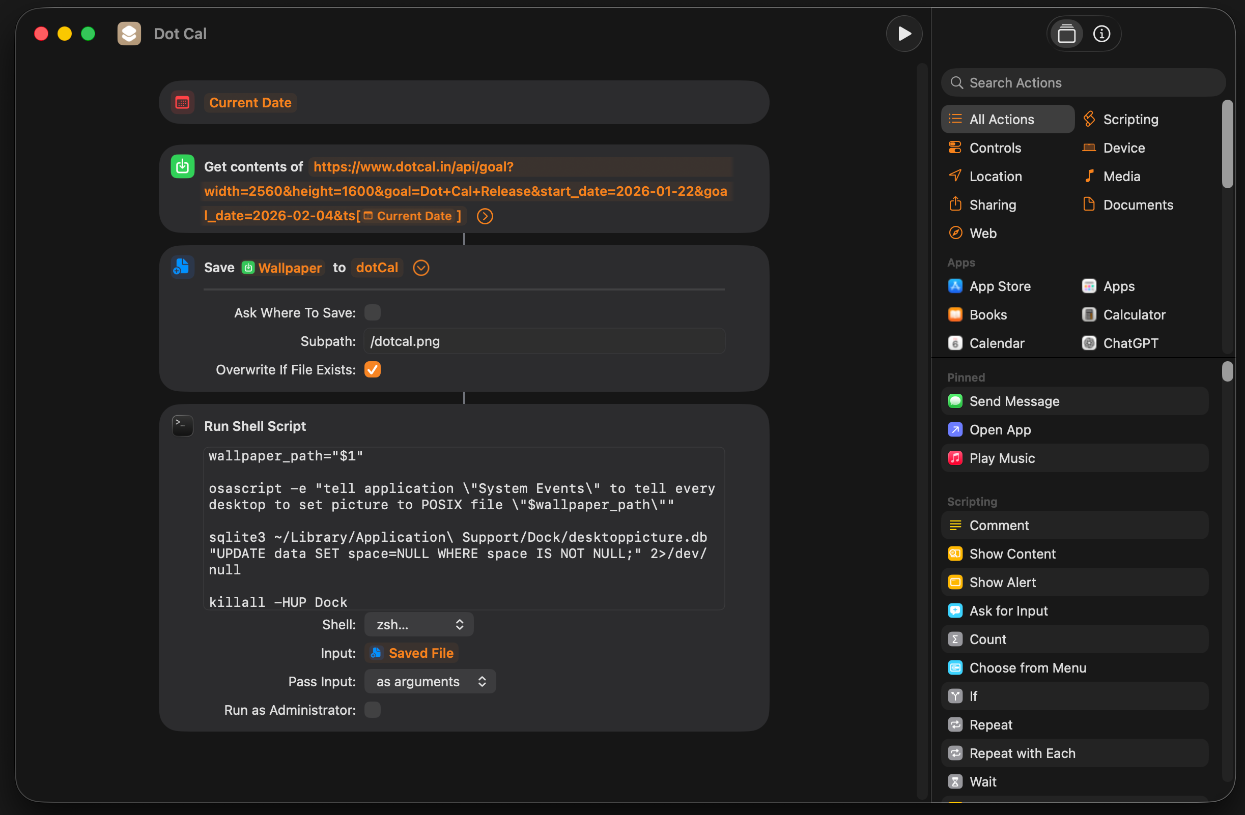 I'm building an automated wallpaper updater that fetches images from an API and sets them as desktop wallpaper on macOS Tahoe. The automation uses AppleScript combined with database manipulation to ensure wallpaper applies to all spaces.