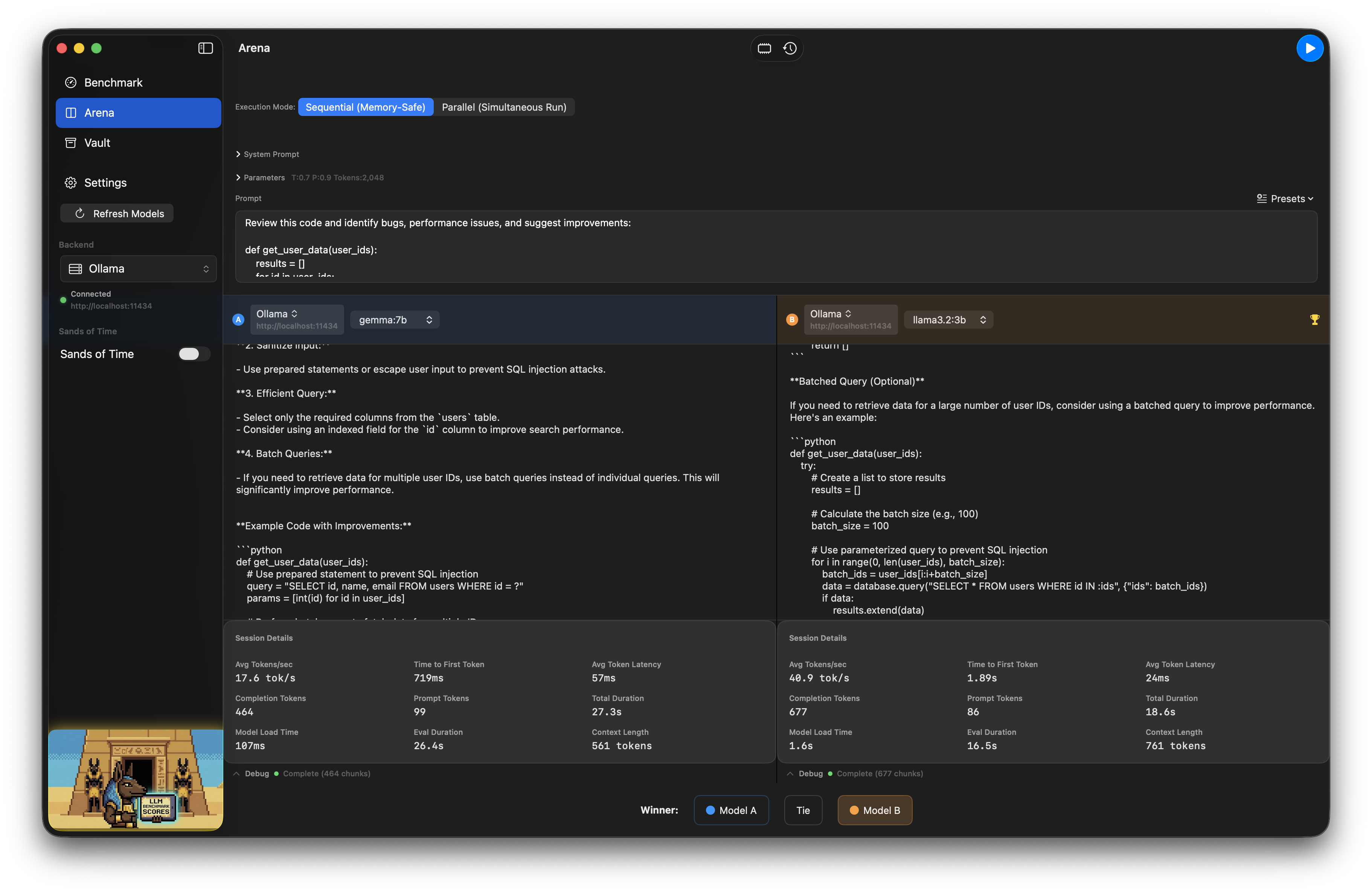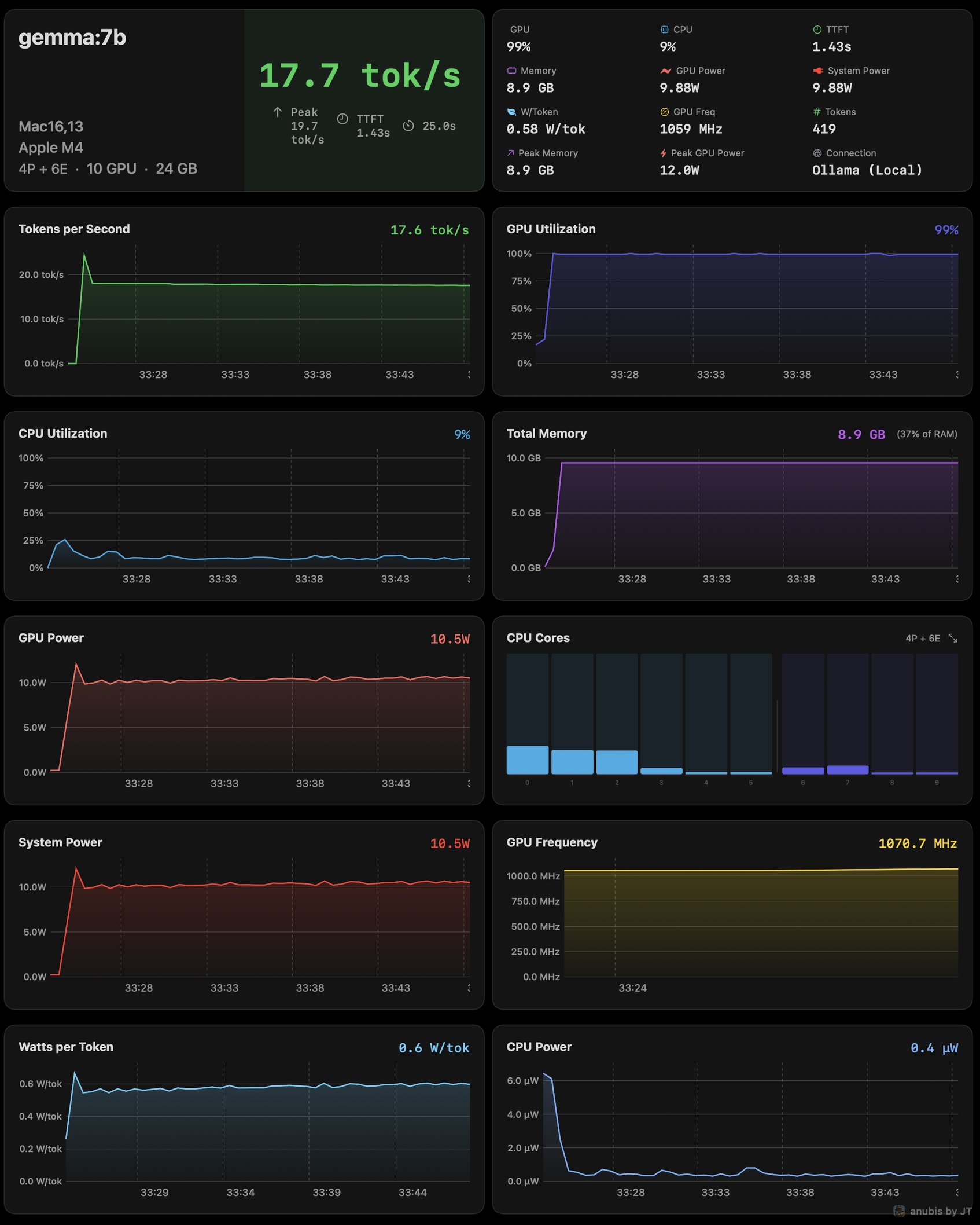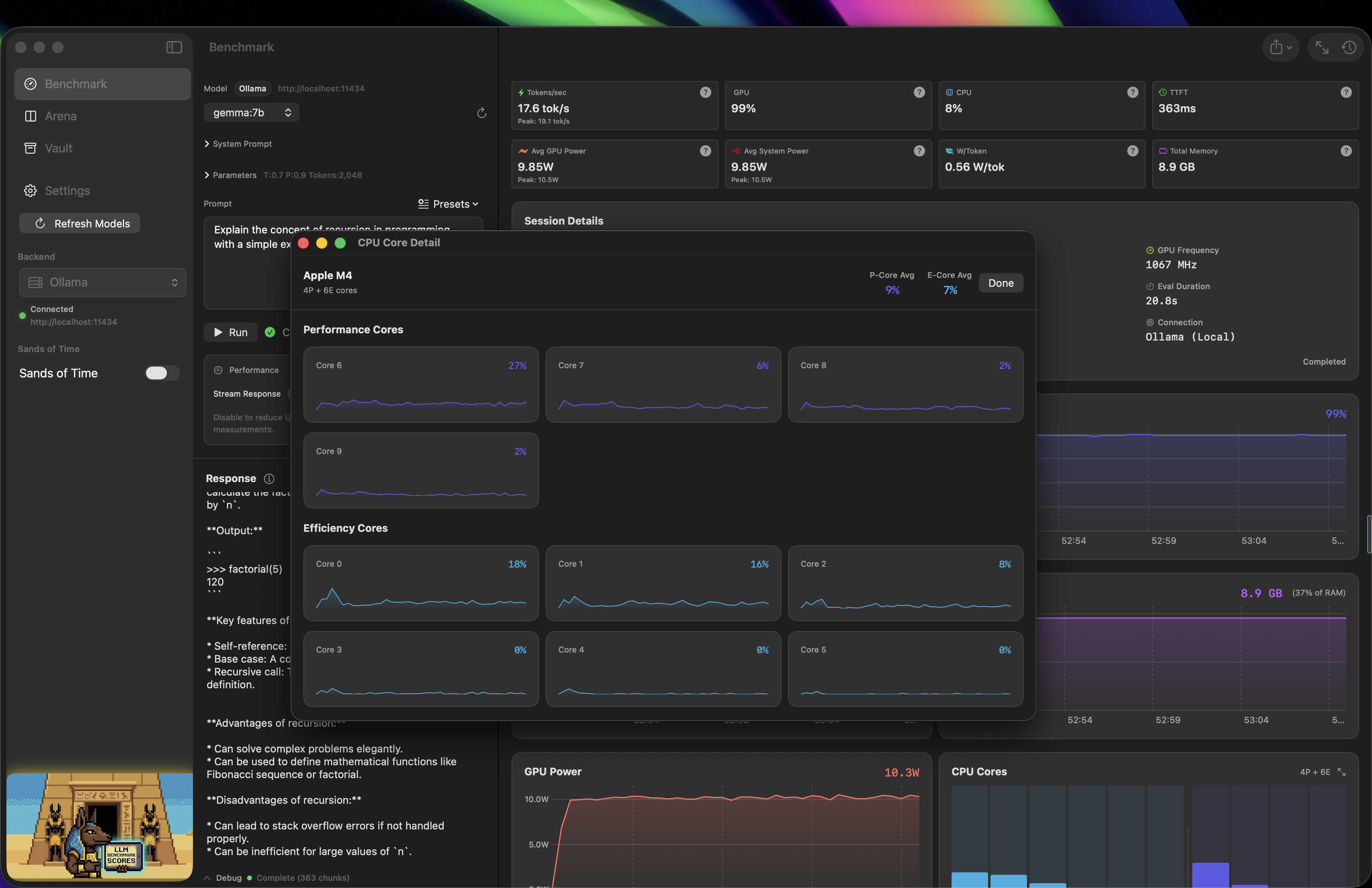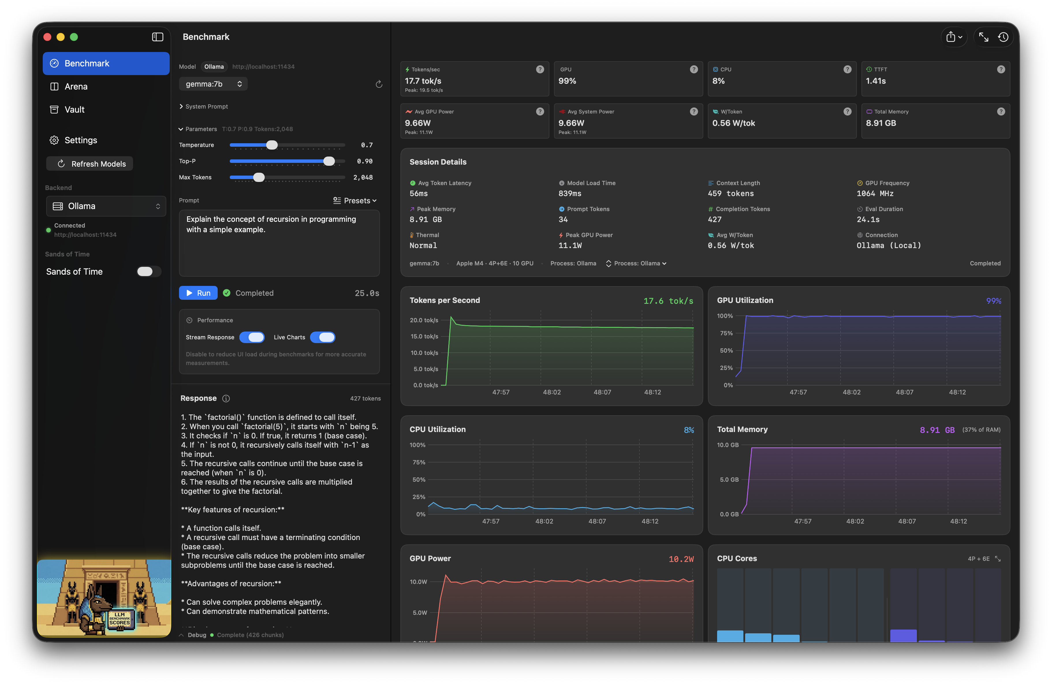 Hi all, I spent the last few months developing an MLX/Ollama local AI Benchmarking suite for Apple Silicon, written in pure Swift and signed with an Apple Developer Certificate, open source, GPL, and free. I would love some feedback to continue development. It is the only benchmarking suite I know of that supports live power metrics and MLX natively, as well as quick exports for benchmark results, and an arena mode, Model A vs B with history. I really want this project to succeed, and have widespread use, so getting 75 stars on the github repo makes it eligible for Homebrew/Cask distribution.