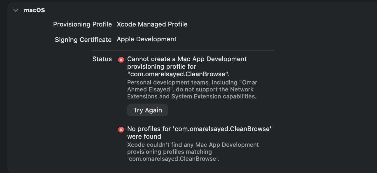 I am trying to sign my Mac app to use Network Extensions capability. But every time I create a profile it displays that to me: