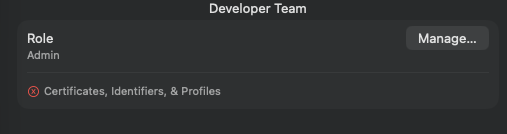 -Xcode Settings: When I navigate to Settings > Accounts and select my team, there is a Red X displayed next to "Certificates, Identifiers & Profiles.",