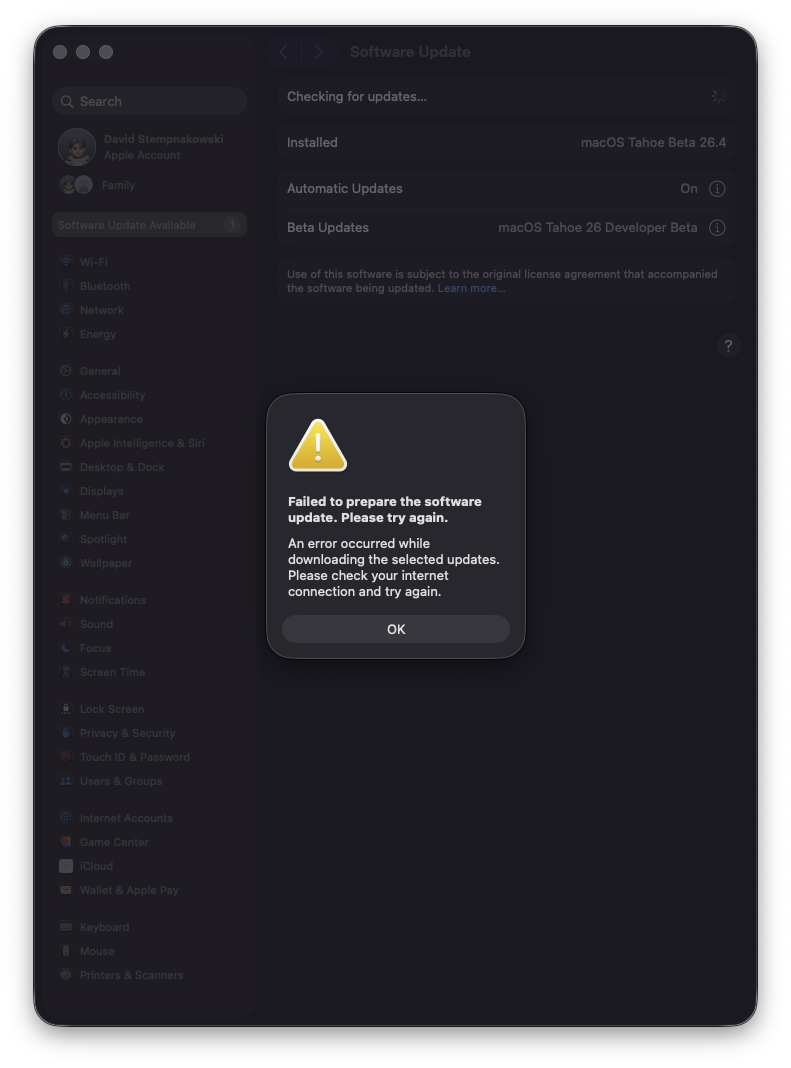 Current System: • Already running macOS Tahoe beta • Attempting upgrade to macOS Tahoe 26.4 Beta (Build 25E5207k)