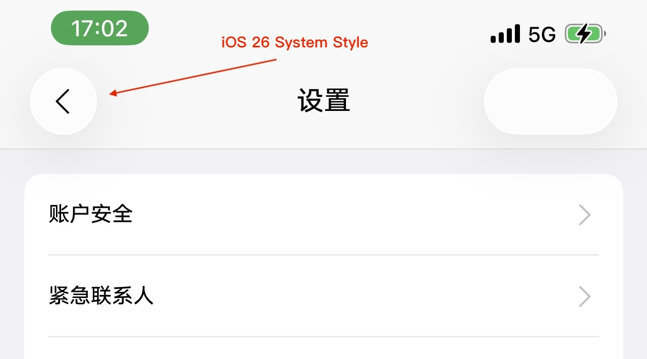 Apple iOS 26 System Navigation Item style (back item with circle background and efffort)