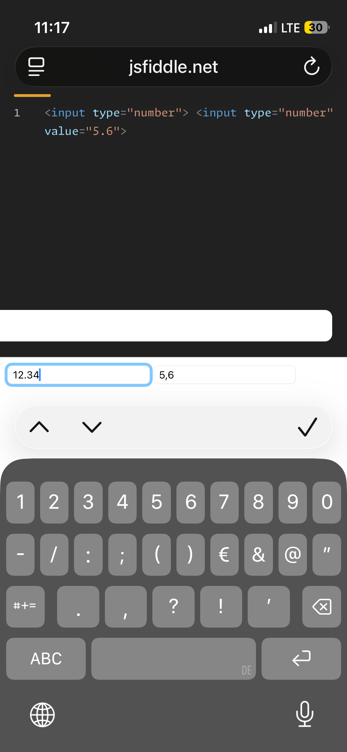 - The input set programatically shows the right decimal separator for German: "5,6". But deleting the “,” and pressing “,” on the onscreen-keyboard again adds a dot instead of a comma and shows the number in international/english: “5.6”.