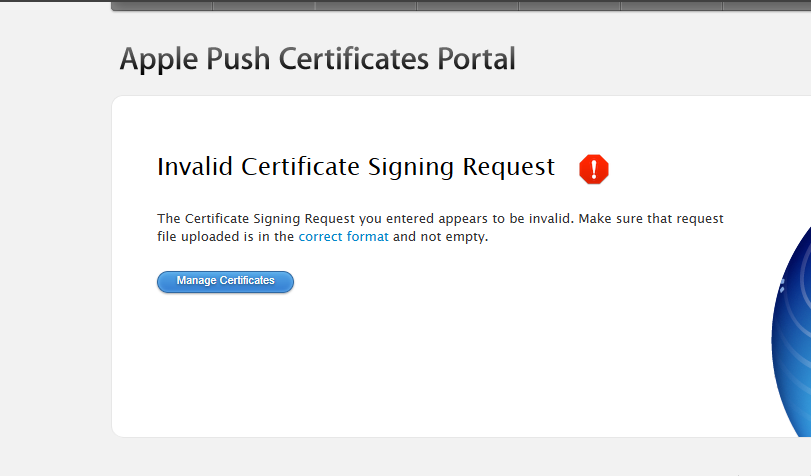I am currently encountering an issue: when creating a new push certificate on the Apple Push Notification Certificates portal, I am required to generate a signature beforehand. Could you please explain the specific rules for this signature and how I should go about generating it? (I previously attempted to generate the certificate using the following command—openssl req -new -key mdm_push.key -out mdm_push.csr—but after uploading it, I received an error indicating an incorrect format.)