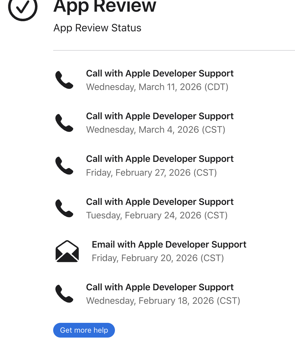 The first time that I submitted a review for my app was on February 3, 2026. It is now March 15, 2026. I am at a dead end. I have been told numerous times by Apple support to resubmit and to call back. I have a large waitlist of over 100 users that want access, and I'm only able to let my internal users test because my test flight has also not been approved.