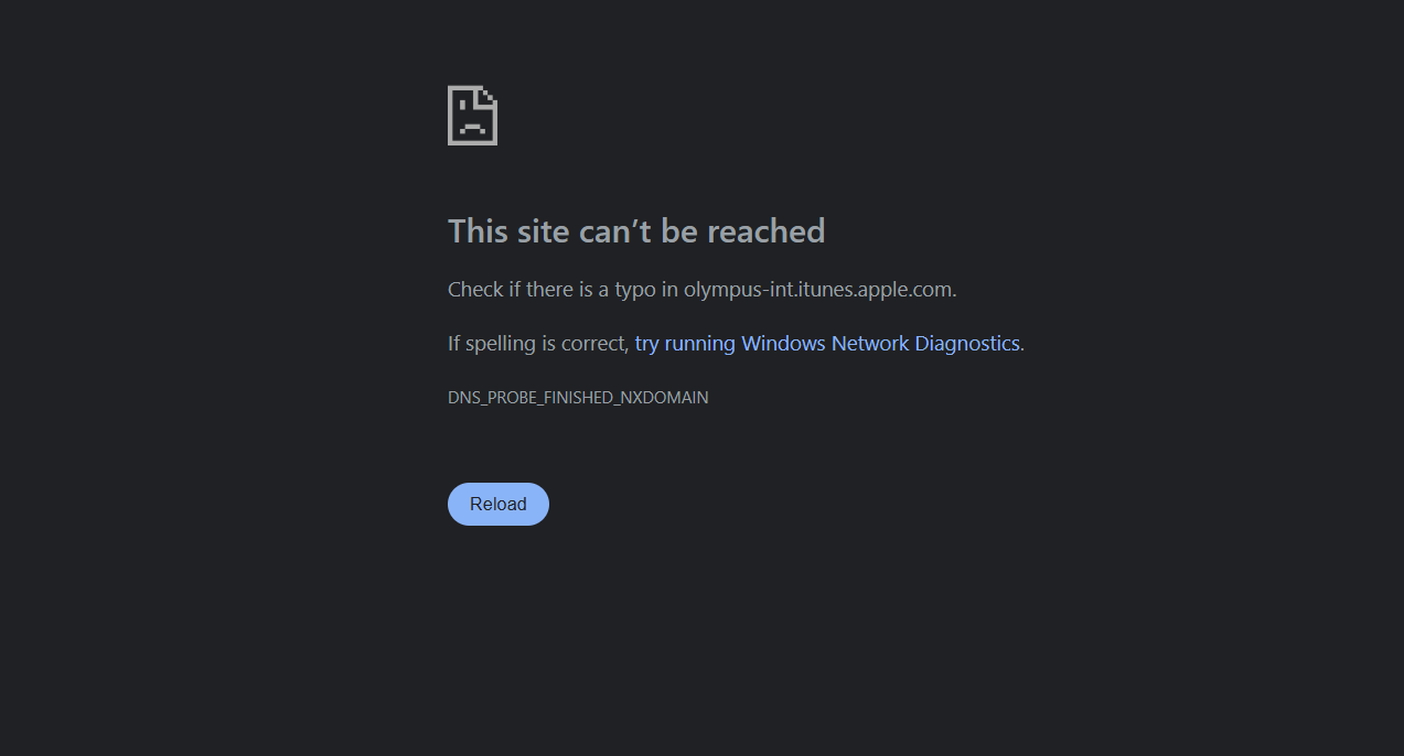 DNS_PROBE_FINISHED_NXDOMAIN The domain mentioned is: olympus-int.itunes.apple.com