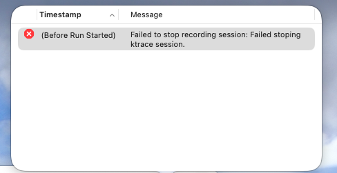 However, Processor Trace keeps showing nothing and I see the error "Failed to stop recording session. Failed stoping ktrace session"