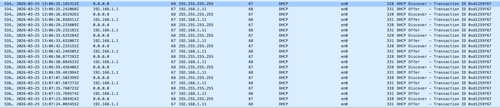From system log I can see BPF socket for DHCP was closed and detached right after attached to en0 in DHCP INIT phase, as result even the DHCP server sent back OFFER(I see server sent OFFER back from packet capture), but there is no persistent BPF socket since it is closed reception during the entire INIT phase.