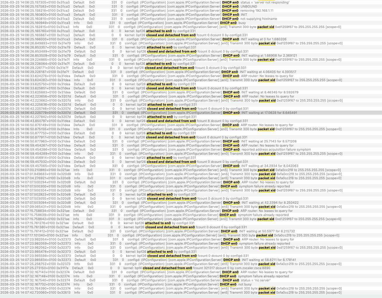 Default 0x0 0 0 kernel: bpf26 attached to en0 by configd:331