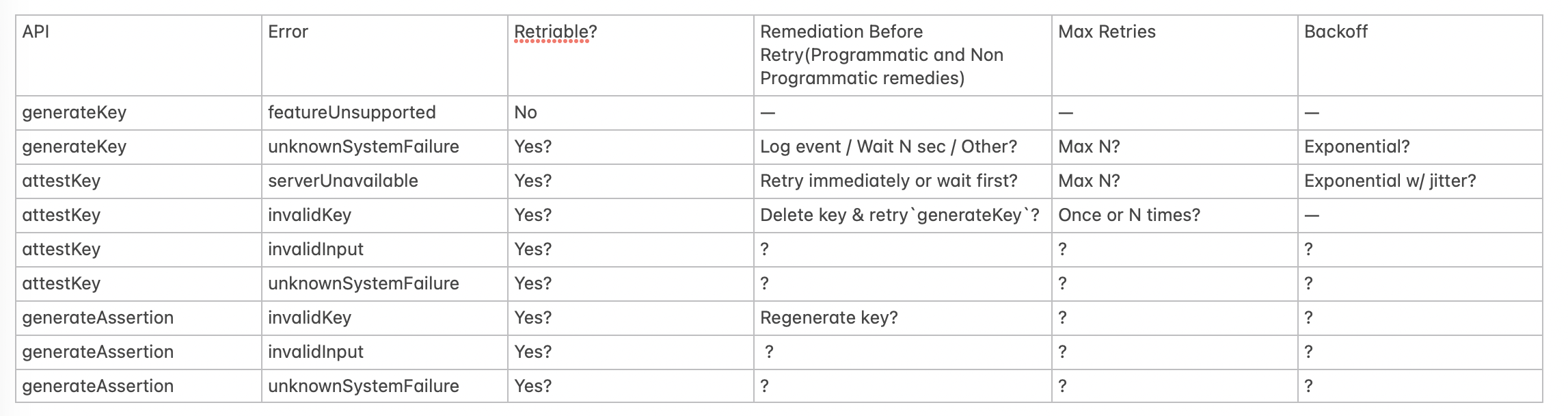 Question: For each API method and error code, please help us with proposal around which errorCode is retriable, whats the remediation pre retry, retry cap and backoff strategy: