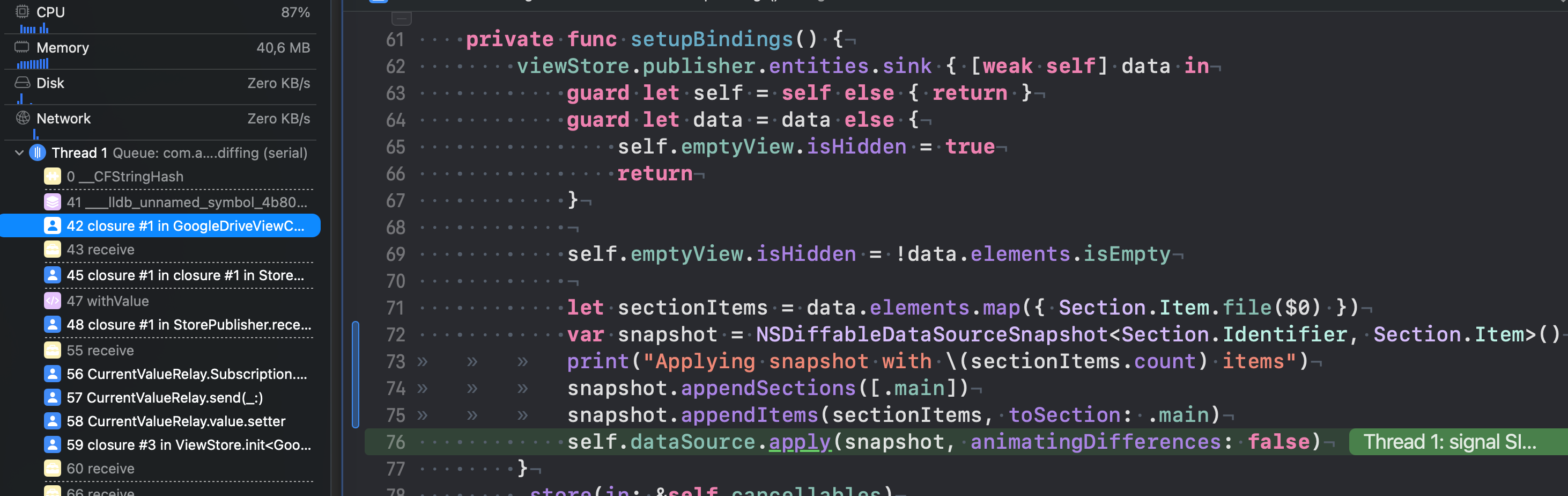 I’m now revisiting the project using the newer Tahoe SDK, and I’m running into an issue with DiffableDataSource. Specifically, the app hangs and CPU usage spikes to 100% when applying snapshots.