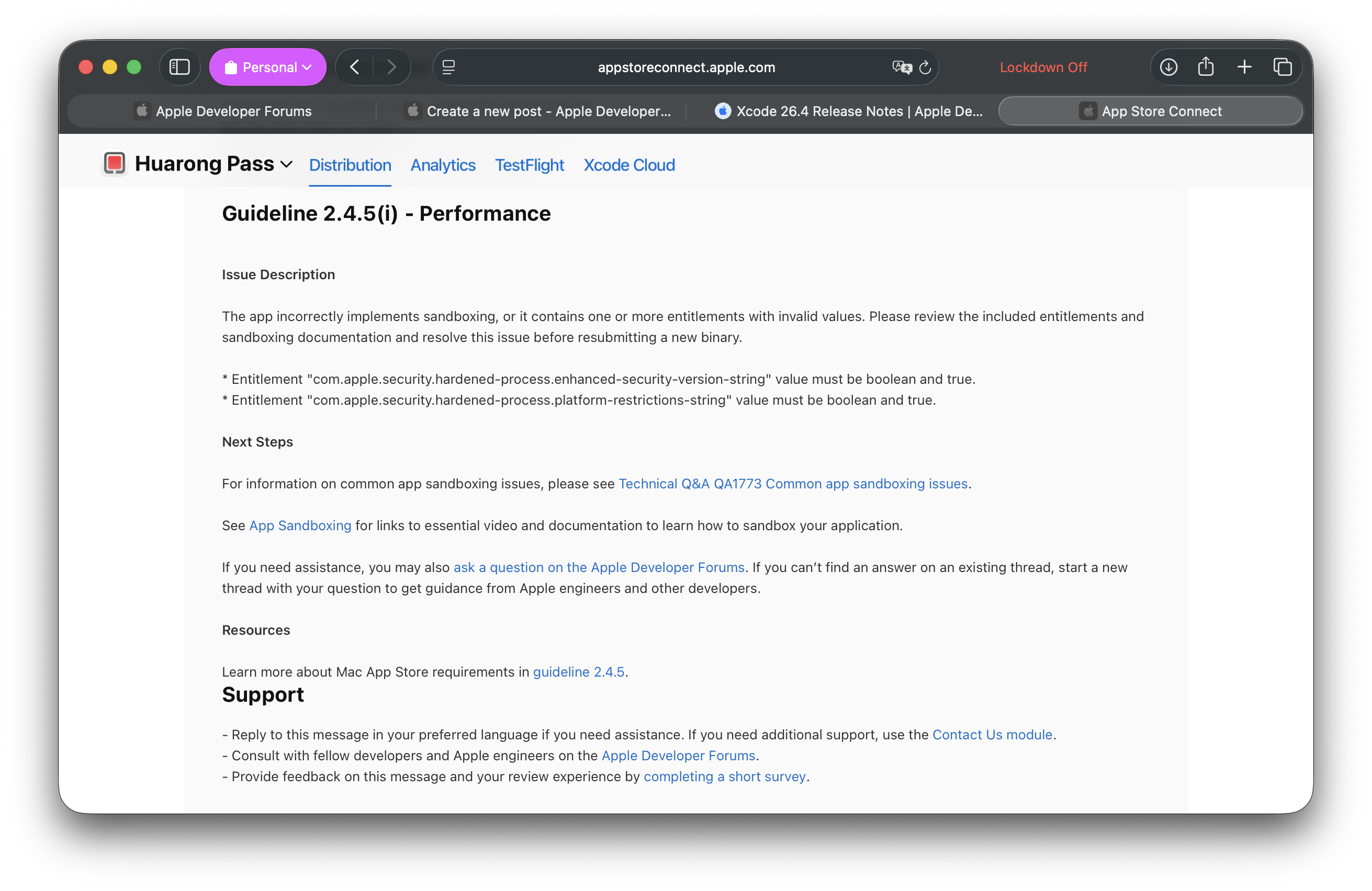Our app is a sandboxed macOS app built with Xcode 26.4. We enabled the Enhanced Security capability in Signing & Capabilities, and we configured the entitlements based on the current documentation.