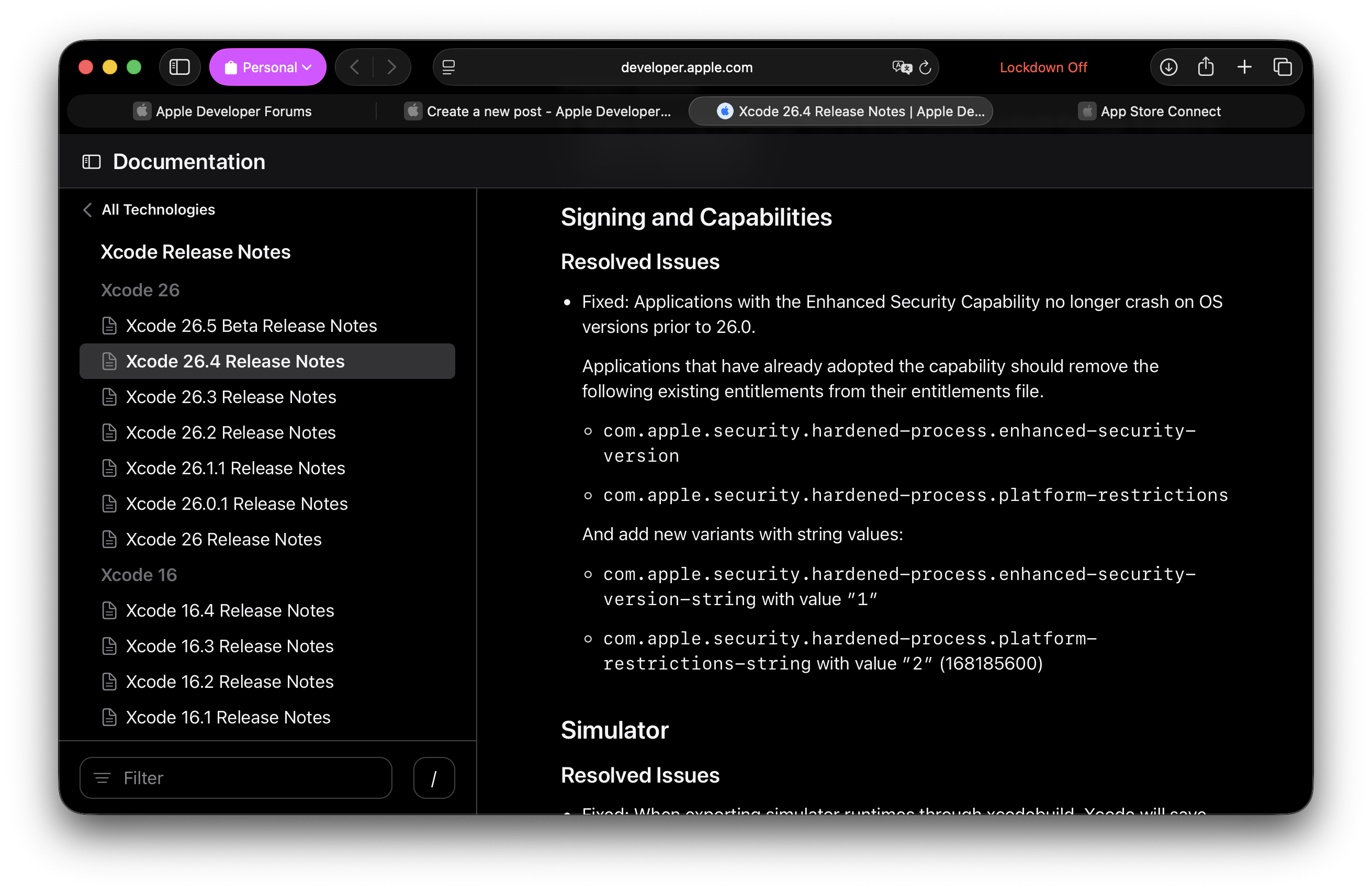 The Xcode 26.4 release notes say apps that already adopted Enhanced Security should remove: