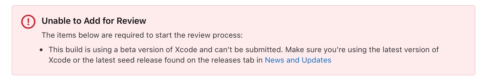 I have been using Swift Playground to build and submit my apps to the appstore for around three years now. Recently I uploaded two of my apps but now when I submit them for approval an error is issued… “Unable to Add for Review”… (see pic attached). I don’t understand it because Playground does not use Xcode as far as I am aware? Can someone advise me what I can do to resolve this? Is it something I have to wait to be fixed by an Apple update?