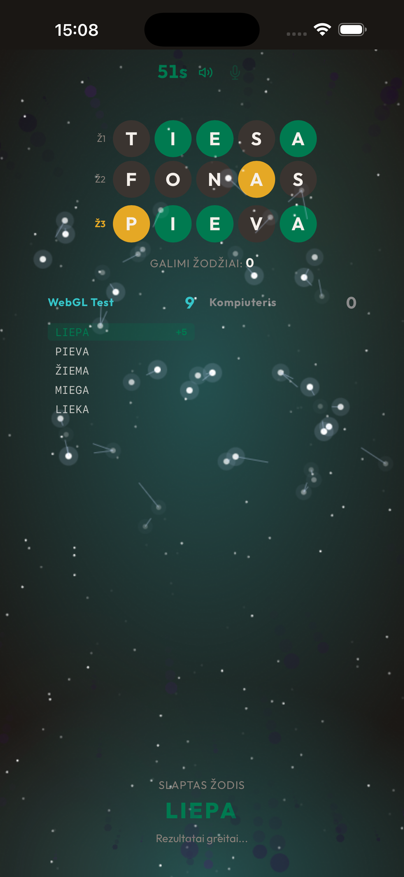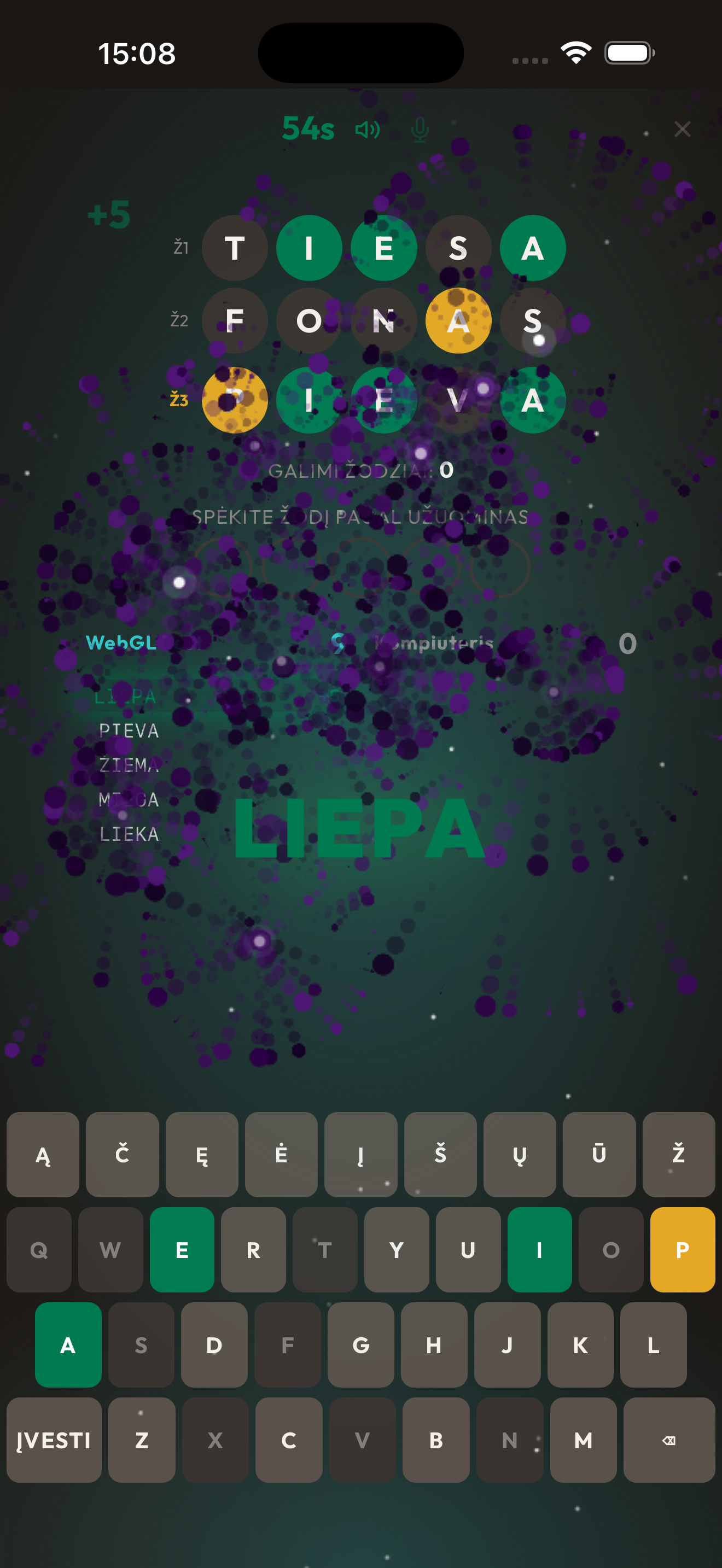 The game is real-time multiplayer (or vs an adaptive difficulty computer that mimics human play), where two players each choose a starting hint word, then based on those hint words (yellow/green letters), in 3 minutes, need to find as many unique words that fit those hints. You see what the player guesses and can't guess the same words. Each word gives 1 point, but the last word and 1 bonus word give +5 points. At 120 seconds, a third hint is provided that limits the number of possible options (making it more likely to reach the very final word with +5 bonus or the bonus word if it wasn't guessed yet). There's a rating system, a customisable reward firework system (which you can show off in multiplayer matches). The game is in Lithuanian only, not targeted globally. When playing with another player, there's a voice chat possibility (initial idea was to create a fun way for friends to have quick voice chats daily who like word games). Screenshots used in store listing attached at the end of the post.