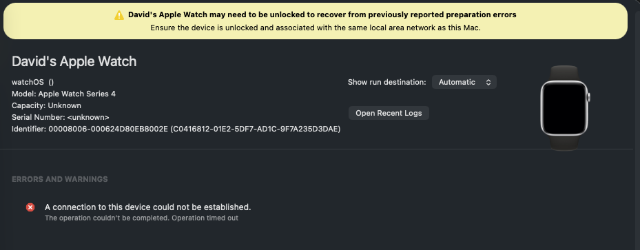 Watch has latest watchOS 10.6.2. Xcode tries to connect and fails. I insured that both the Mac and the watch are using the same WiFi network (2.4) - and the mac has no other network interface.
