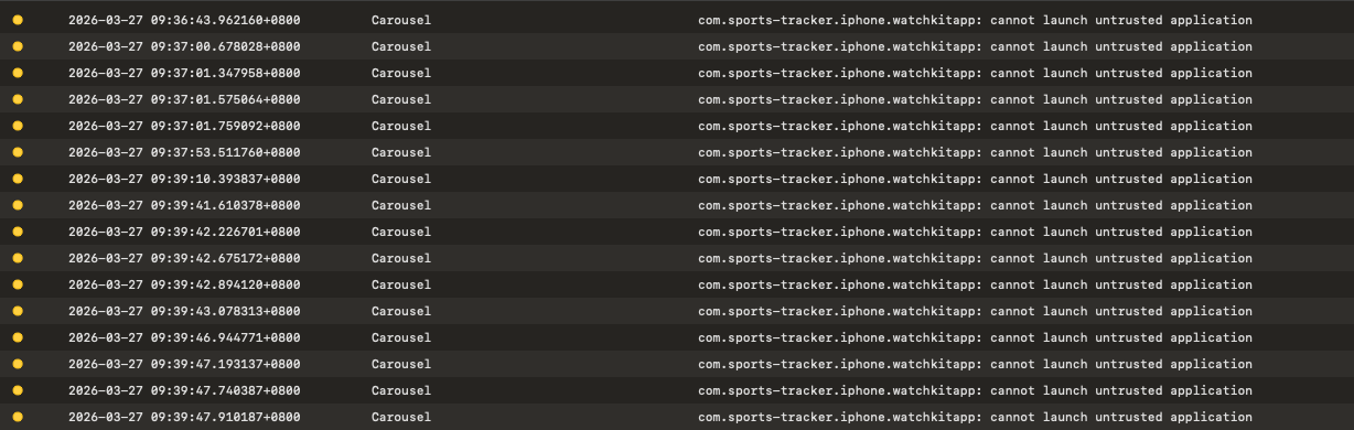 I have a app that has both mobile and watch versions. Recently some testers report that the watch app could not be launched if the put the app in the background and then resume. And if they kill the app and try to launch again, there is no any response when tapping the app icon. I managed to export some system logs, and this info in the screenshot looks suspicious.