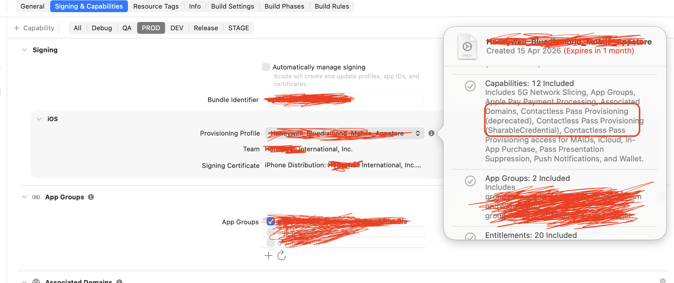 - If we remove Contactless Pass Provisioning from the app entitlements/capabilities, the exact same profiles immediately become eligible and the signing error disappears.