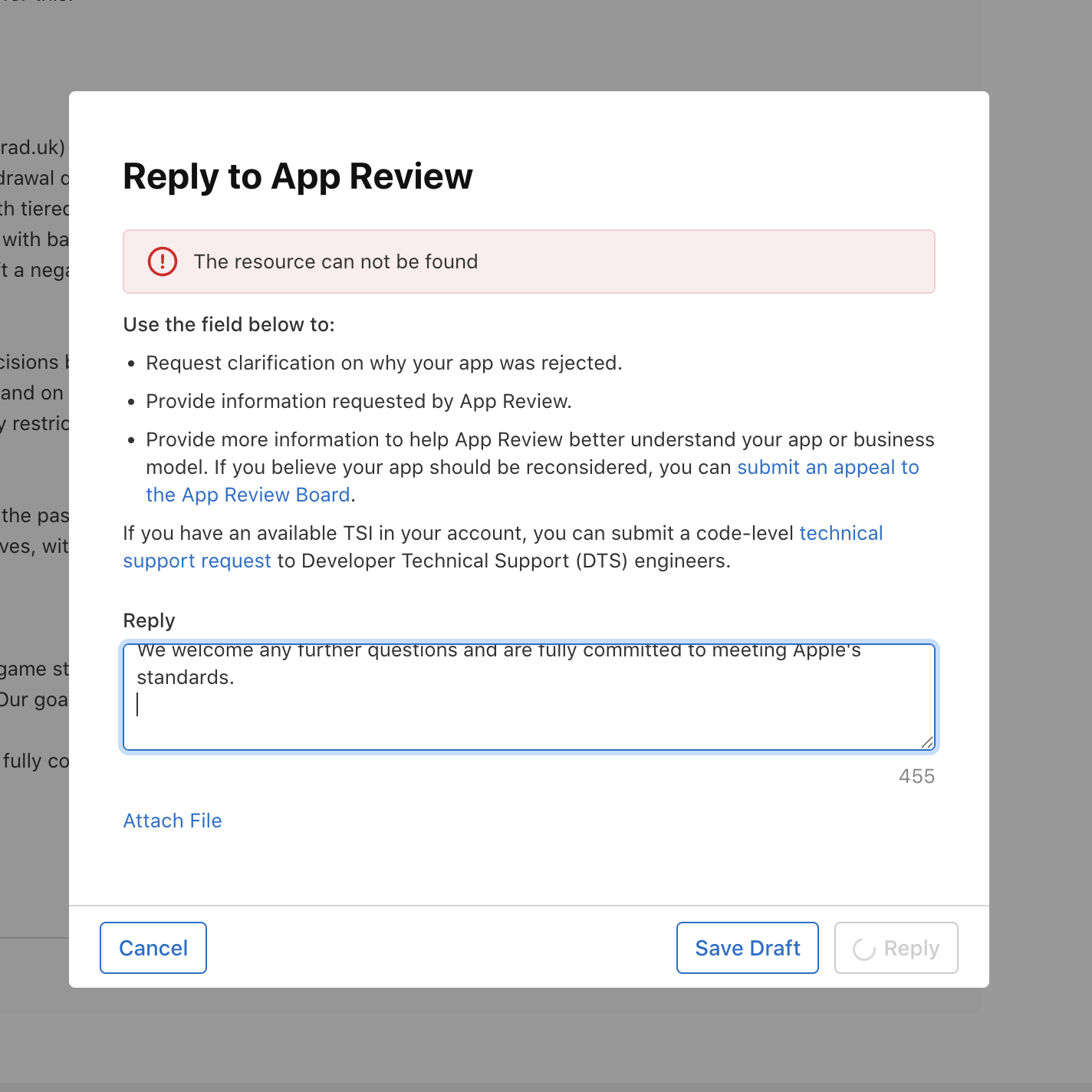 Hi everyone, I am hoping someone here has experienced this and can help, because we are in a really difficult position right now. We received a notice from App Review regarding Guideline 5.6.4 and have been working hard to prepare a full response with supporting evidence. The problem is that a draft response exists in App Store Connect that we cannot submit or delete. Every time we click either Submit or Delete Draft, we get the same error: "The resource cannot be found" That is it. No further explanation, no workaround, nothing. The draft is just stuck there and we cannot get past it. Because we could not submit through the normal channel, we uploaded a new build with our action plan included in the notes, hoping that would reach the review team. The build has been sitting there unreviewed. We have raised a support ticket with Apple Developer Support and have not received any response. The clock is ticking. App Review has given us a deadline to respond or face removal from the App Store. We have our response ready. We have our evidence ready. We just physically cannot submit it because of what appears to be a technical bug on Apple's side. Has anyone else hit this "resource cannot be found" error on a draft App Review response? Is there any other channel we can use to get this in front of the App Review team directly? We have tried everything we can think of. Any help would be massively appreciated. This is our livelihood and the deadline pressure combined with a broken system is genuinely distressing. Thank you