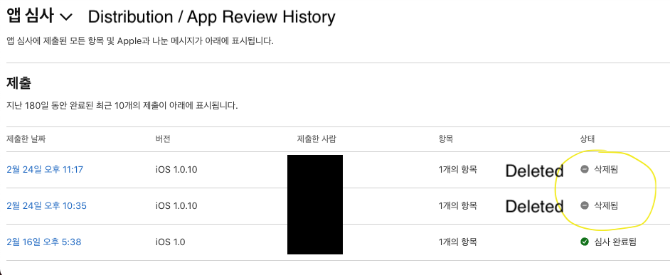 App Review history: no active review for version 1.0.10, previous submissions are deleted