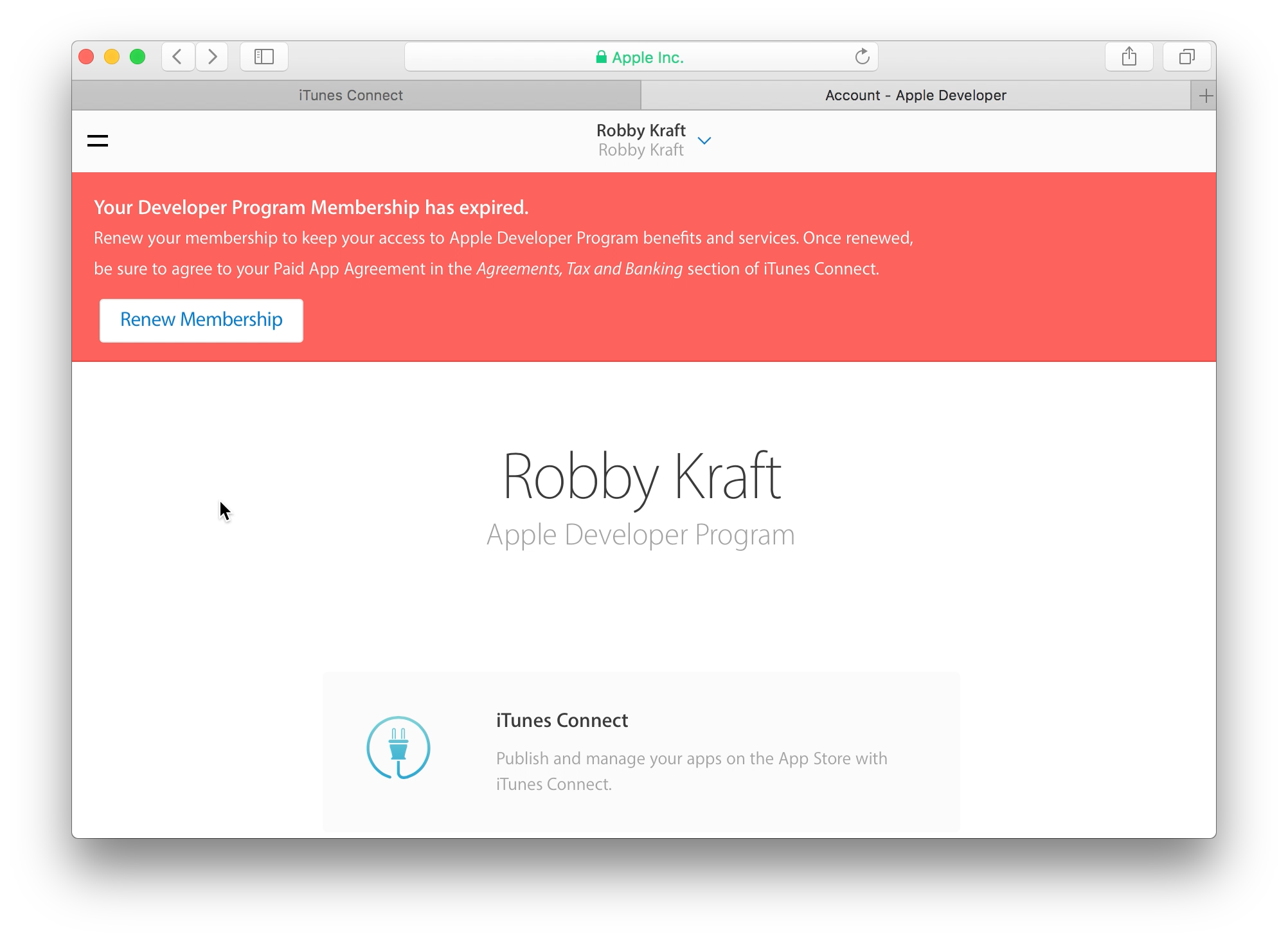 Under developer.apple.com, clicking on the button "Renew Membership". screenshot: