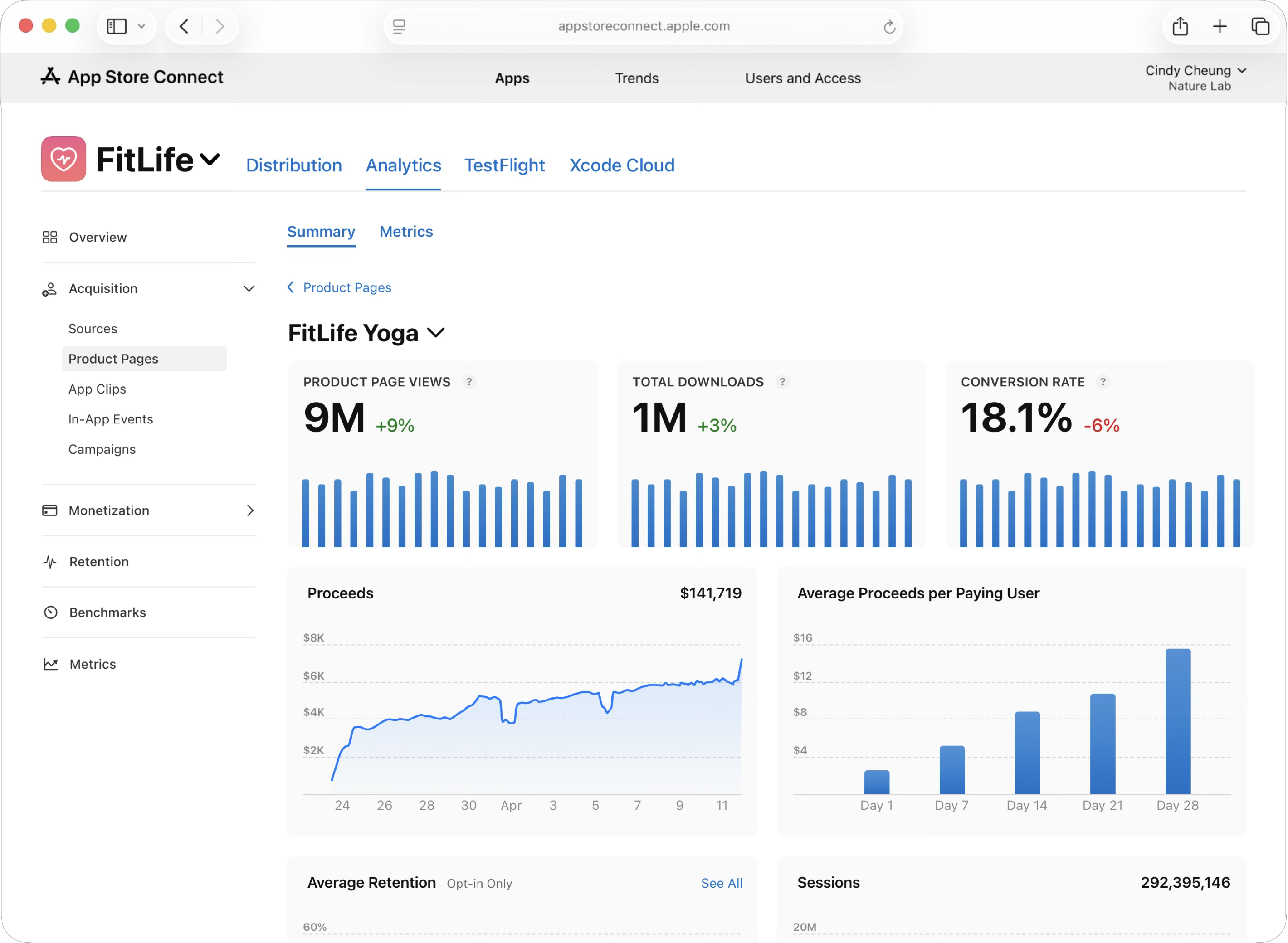 The Custom Product Page dashboard displays key performance metrics like Product Page Views, Total Downloads, and Conversion Rate. Below these, a Proceeds graph shows daily revenue, while the Average Proceeds per Paying User chart details monetization per user across various retention milestones.