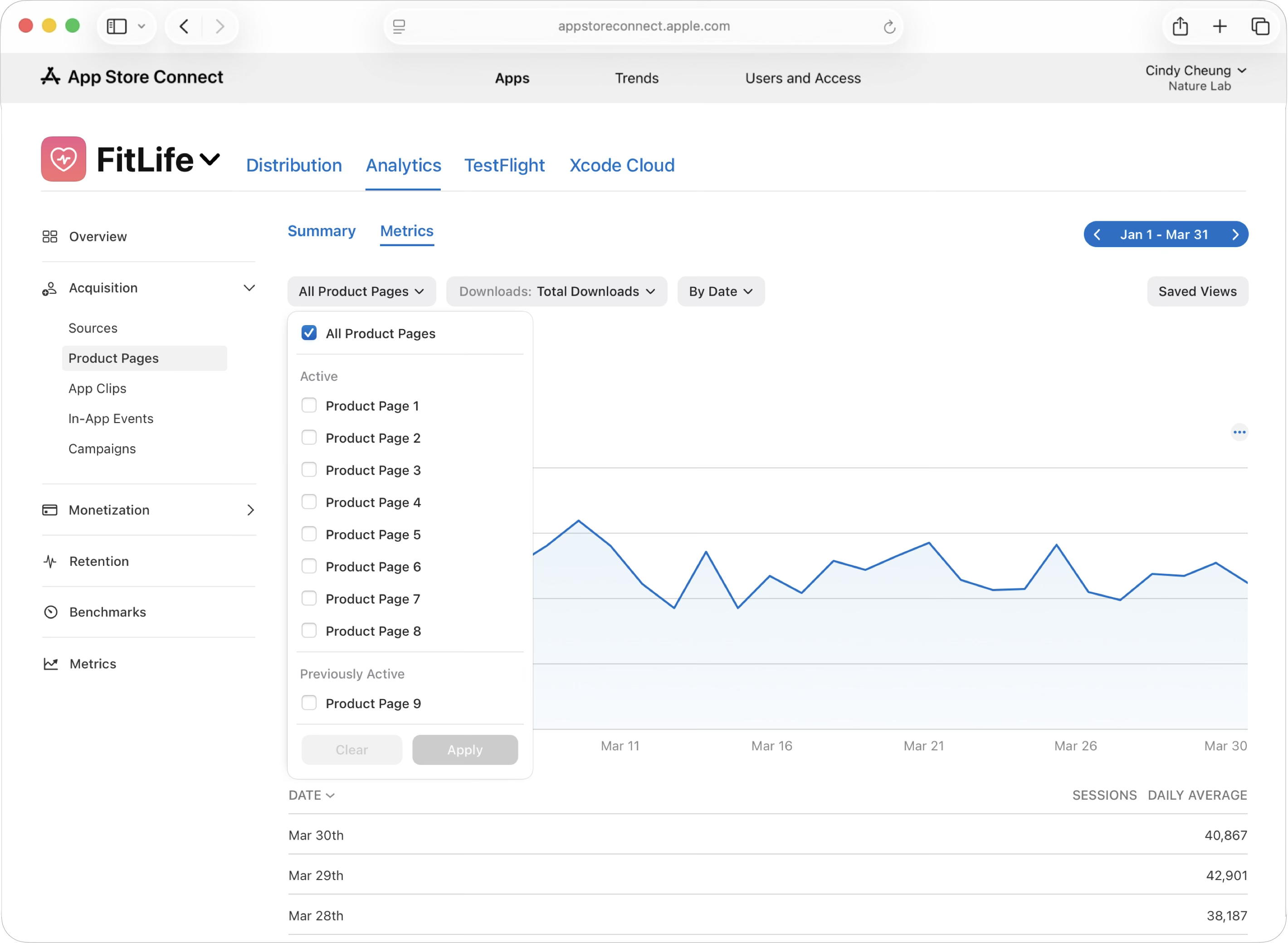Analytics in App Store Connect helps you measure each page across the full customer journey, including product page views, downloads, and conversion rate, along with downstream metrics like subscription performance and sales. This lets you evaluate not only which page converts best—but which page brings in the highest-value users.