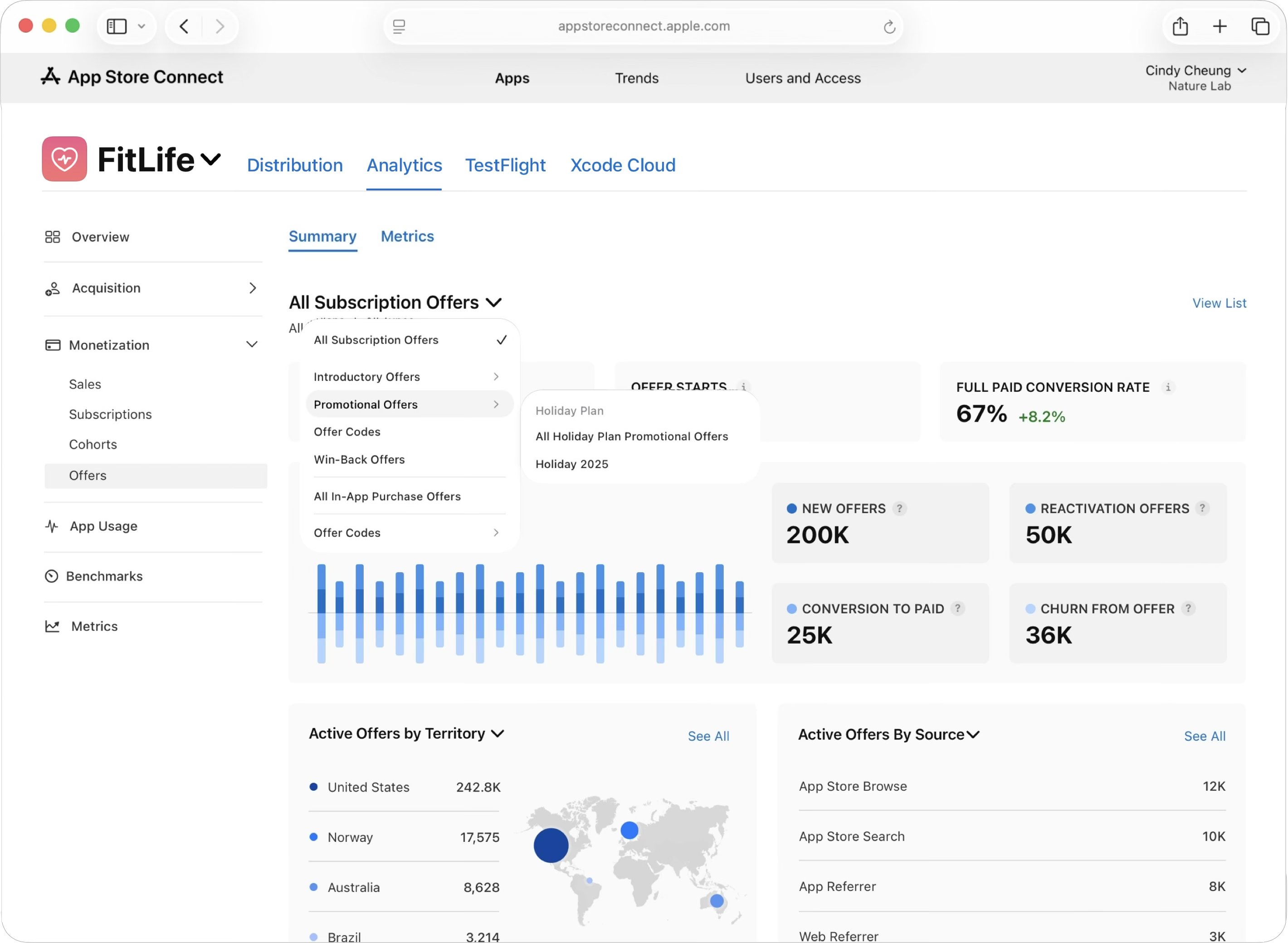 The Offers dashboard provides a comprehensive overview of your subscription offers' performance. It displays key metrics such as the volume of new and reactivated offers, the rate at which offers convert to paid subscriptions, and the churn rate from offers. Additionally, the dashboard breaks down active offer performance by geographic territory and by the acquisition source.