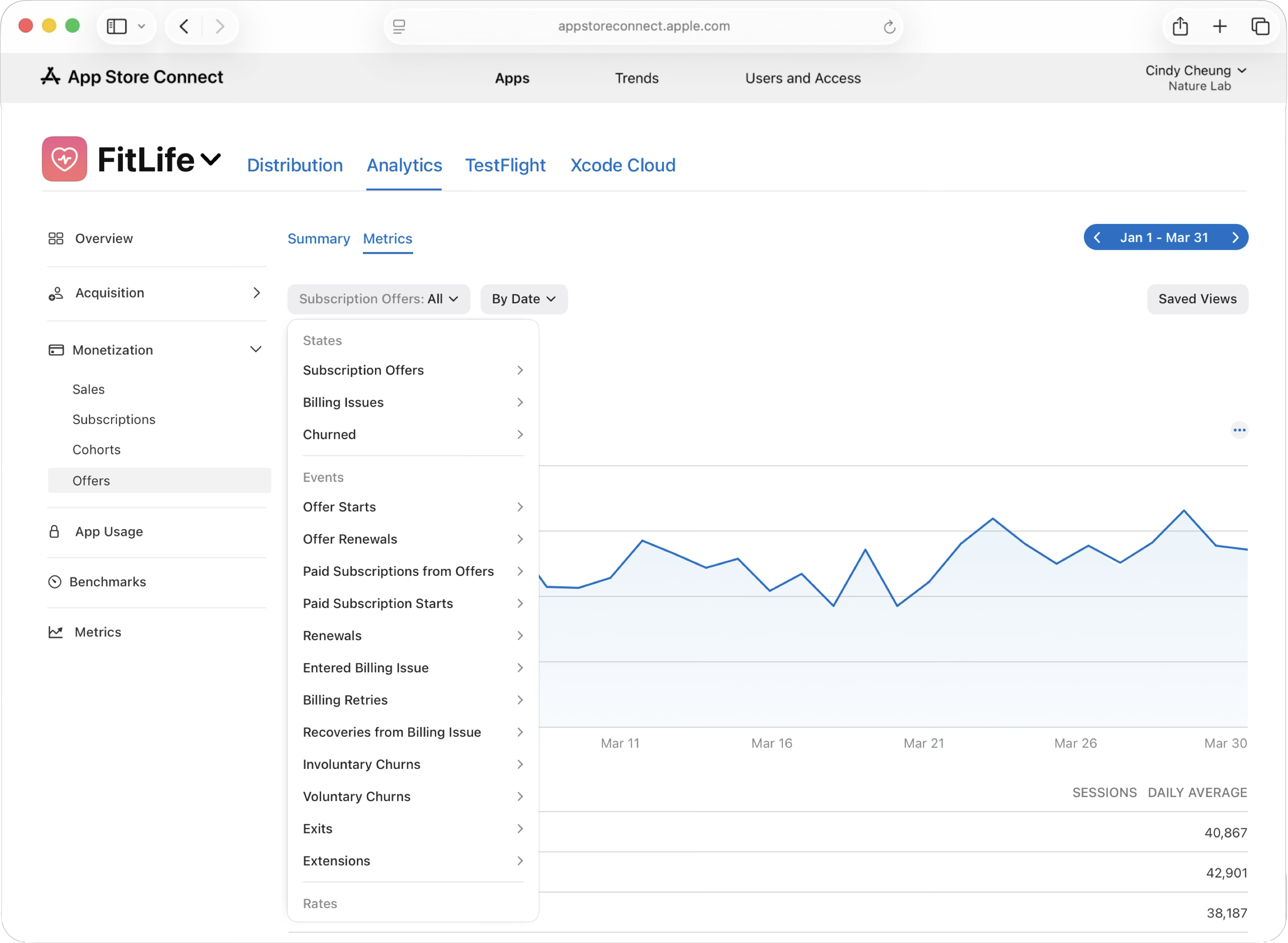 Apply filters to analyze your subscription offer performance and lifecycle. For example, adjust the date range, or track various metrics under States and Events to understand different aspects of your offers, including offer adoption, conversion to paid subscriptions, retention and churn, or billing status.