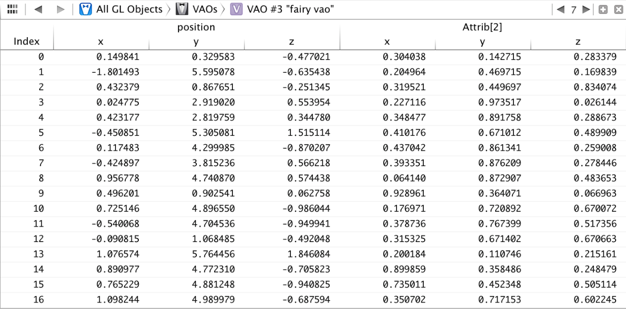 A vertex array object (VAO) encapsulates one or more data buffers in OpenGL ES memory and the attribute bindings used for supplying vertex data from the buffers to a shader program. (For details on using VAOs, see Consolidate Vertex Array State Changes Using Vertex Array Objects.) Because the VAO bindings include information about the format of the buffers’ contents, inspecting a VAO shows its contents as interpreted by OpenGL ES (see Figure B-10).