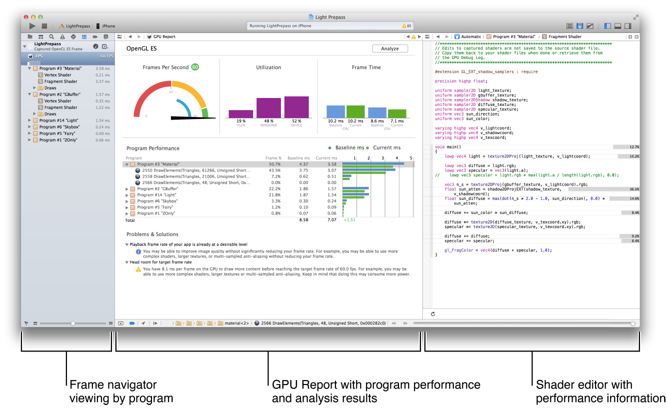 Xcode tools for debugging, analyzing, and tuning OpenGL ES applications are useful during all stages of development. The FPS Debug Gauge and GPU report summarize your app’s GPU performance every time you run it from Xcode, so you can quickly spot performance issues while designing and building your renderer. Once you’ve found a trouble spot, capture a frame and use Xcode’s OpenGL ES Frame Debugger interface to pinpoint rendering problems and solve performance issues.