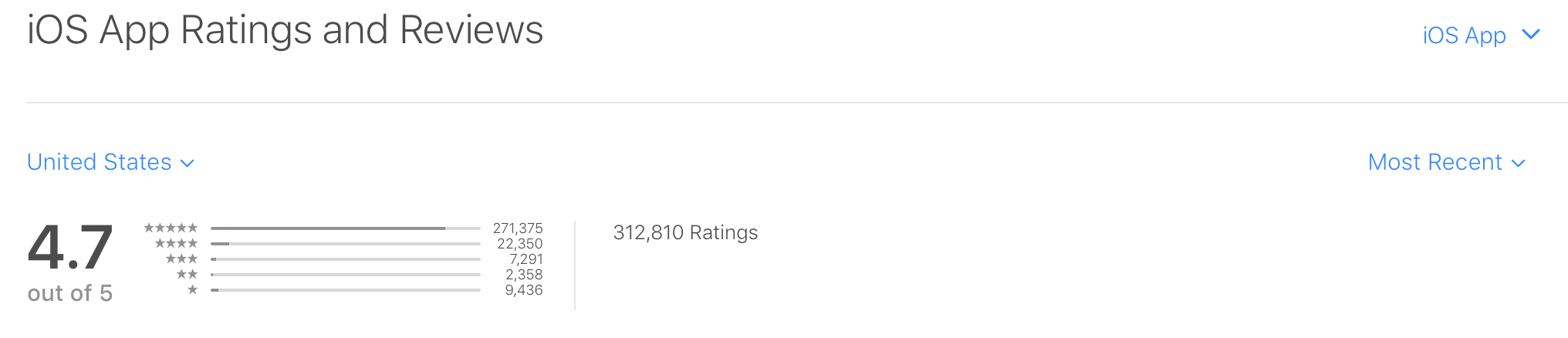 특정 플랫폼에서 평가 및 리뷰를 확인하려는 경우, 오른쪽 최상단의 드롭 다운 메뉴에서 해당하는 플랫폼을 선택하십시오. tvOS 앱의 경우 등급만 표시됩니다.