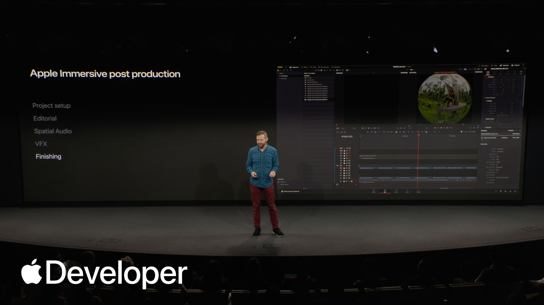 Learn how to protect presence throughout post production for Apple Immersive Video. The session covers how to review dailies on Apple Vision Pro, use editorial transitions to reset depth, maintain accurate spatial cues in audio, ensure proper 3D behavior for VFX, reduce visual noise, and grade toward an idealized yet natural look.