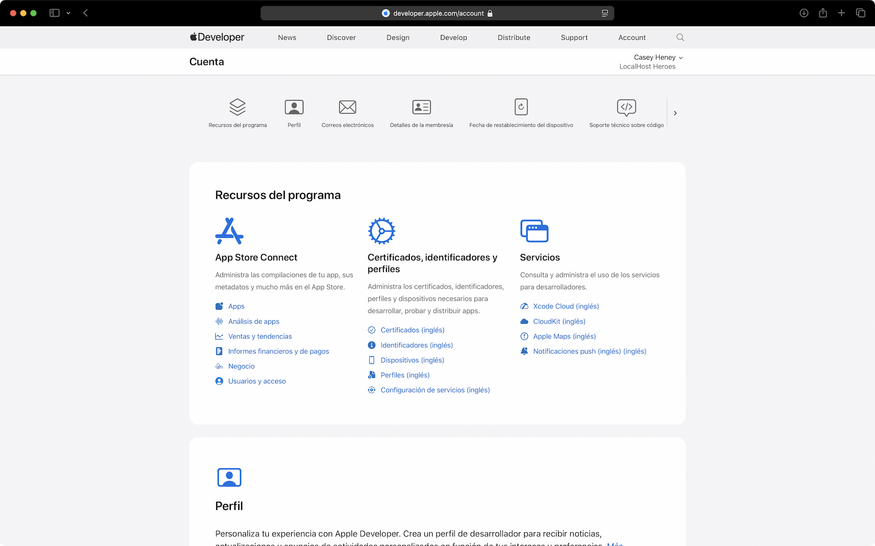 Desde cualquier lugar del sitio web de Apple Developer, haz clic en Cuenta en la parte superior derecha.