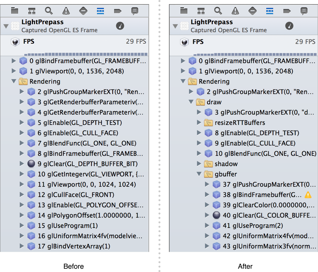 class to draw OpenGL ES content, it automatically creates a “Rendering” group containing all commands in your drawing method. Any markers you create are nested within this group.