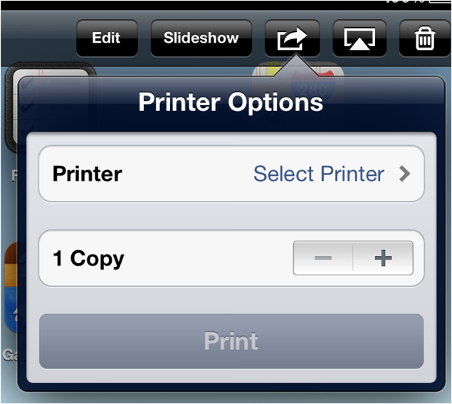 The kind of user interface shown depends on the device. On iPad, the UIKit framework displays a popover view containing the options, as shown in Figure 5-2. An app can animate this view to appear from the print button or from an arbitrary area of the app’s user interface.