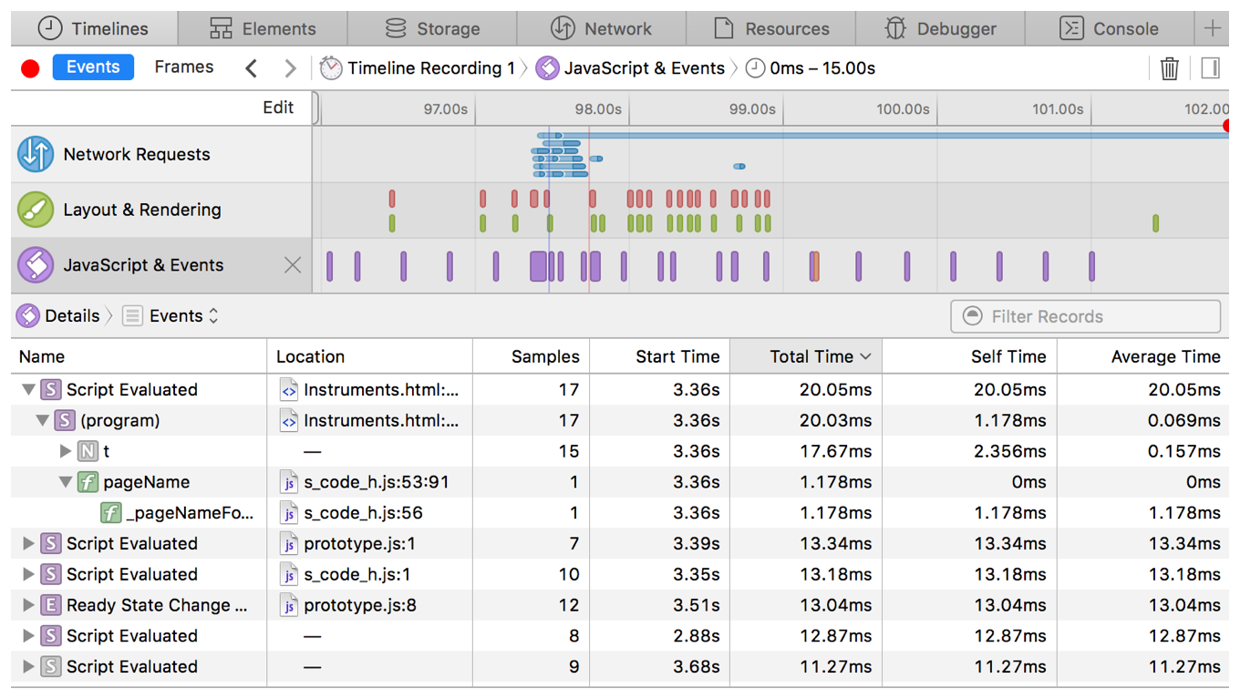 JavaScript executed during a recording session is represented as a purple horizontal bar in the timeline. Evaluated scripts, dispatched events, animation frames, and timers are listed in the table in the content browser, as shown in Figure 3-3.