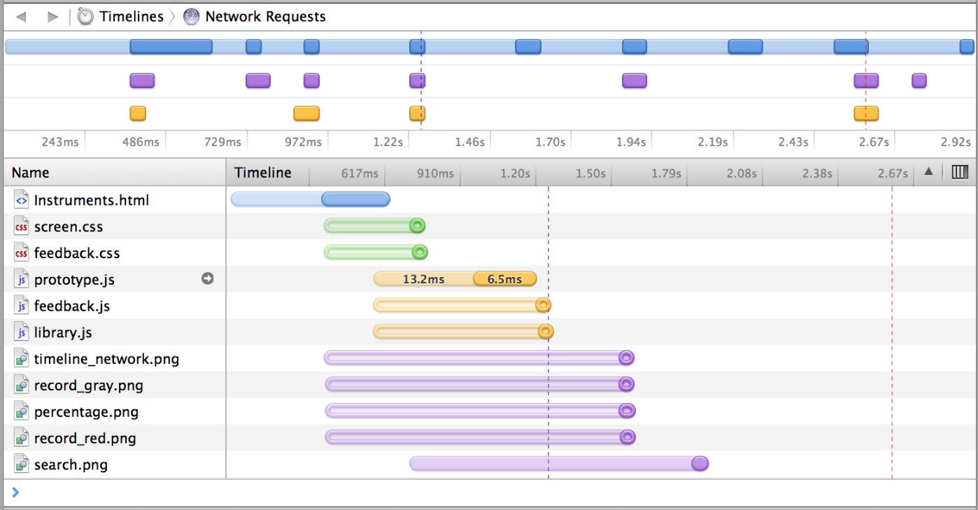 The vertical dashed blue line indicates when the DOM becomes available to Safari, and is equivalent to the DOMContentLoaded JavaScript event. The red line indicates when all resources have finished loading, and is equivalent to the load JavaScript event.