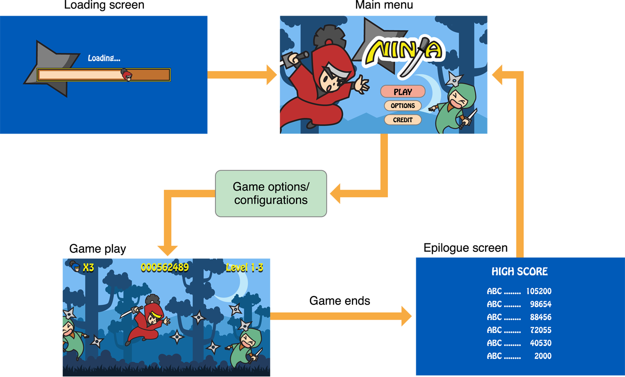 After the game has loaded enough resources, it transitions to a menu screen. Typically, this is the first interactive screen the player sees. The menu screen has a series of buttons that players use to launch the gameplay or other features of the game. For example, any or all of the following functions are commonly accessed from the menu screen: