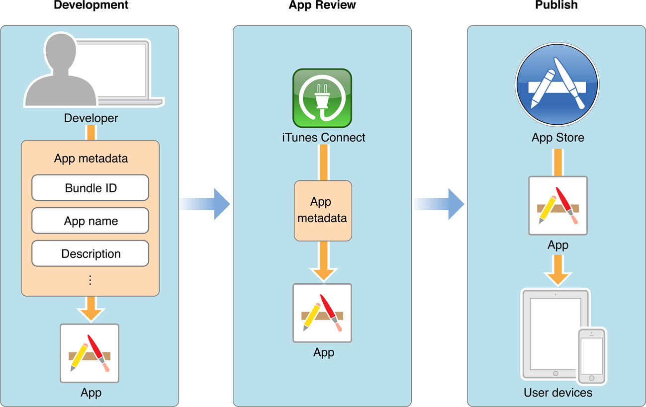 After your app is approved, you choose when it is published. Once published, the app bundle and metadata are copied from iTunes Connect to the App Store. There, users discover and purchase the app. Once purchased, the app bundle is downloaded to the user’s device.