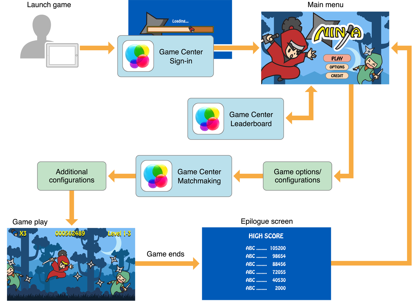 Figure 1-1 shows an example model for a game’s user interface, shown as a series of screens and transitions between them. Not all games use this exact organization of user interface screens, but it provides a useful starting point for a discussion of how adding Game Center might alter your game’s user interface.