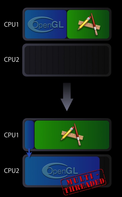 If you enable multi-threaded OpenGL execution in your application, some of the execution time spent in the OpenGL framework is transferred to a second thread. The second thread will optimally run on one of the available CPU cores. Since part of the OpenGL framework’s workload has been parallelized, OpenGL calls will return control to your application sooner and more CPU cycles will be available for its main thread.