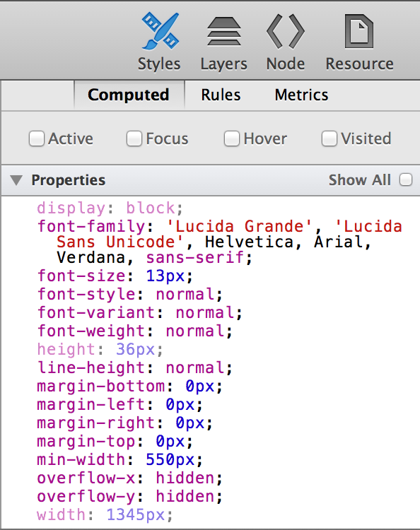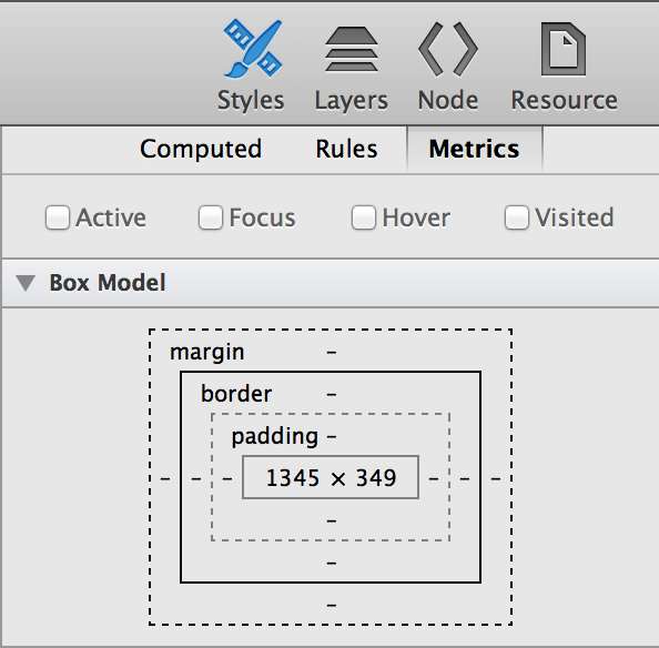 The Box Model provides an easy way to visualize the dimensions of an element at a glance. From the center out, it shows the width and height, padding, border, and margin of the selected node. All of the values are editable; double-click and type in a value to see the change update immediately. As in the Rules tab, you can hold the Option key while pressing the up- or down-arrow keys to increment or decrement the current value.