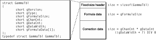 The entry point to the variable-length portion of the gamma table, consisting of the formula data, if any, followed by the correction data. If a gamma table is hardware-invariant (
