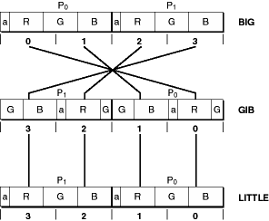 16-bit pixel encoding includes a 1-bit alpha value and three 5-bit red, green, and blue color components, as shown in Figure B-2.