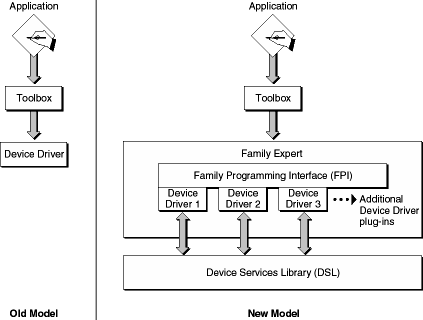 The separation of application and driver services in Mac OS is a big change that starts with the Power Macintosh computers with the PCI bus architecture. The difference between the old API model and the new API/driver services model is diagrammed in Figure 6-1.