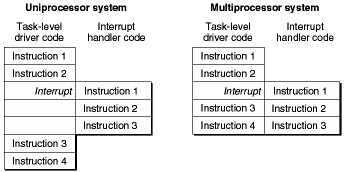 In future Power Macintosh computers that feature symmetric multiprocessing (SMP), a device driver will not be able to assume that hardware or secondary interrupt level execution preempts all task level execution. In a four-processor system, for example, one processor might be running a hardware interrupt handler, another running a secondary interrupt handler, and the other two running tasks. This behavior is different from that of a uniprocessor system, where an interrupt handler normally runs to completion between two task-level instructions. The difference is illustrated in Figure 6-3.