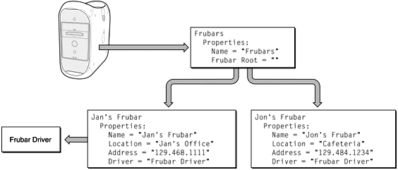 Software uses Registry properties to find other software. For example, if a user specifies a name while running an application, the application may look up the name in the Registry and use the properties associated with it to determine what the name represents in the system. For example, a distributed application could ask the user to choose a network interface. From the properties that accompany the name of the interface in the Registry, the application could find the device driver that controls the network interface and the parameters needed to open the network device, as diagrammed in Figure 10-1.