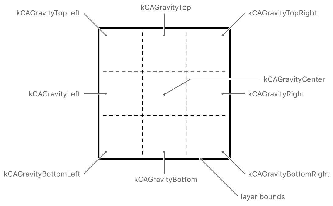 constant, each constant pins the image to a particular edge or corner of the layer’s bounds rectangle. The kCAGravityCenter